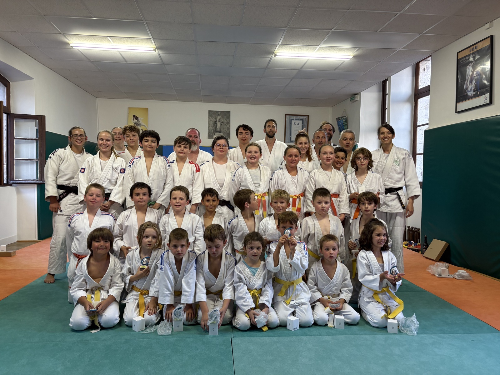 Le vendredi 20 juin , nous avons clôturé la saison par la traditionnelle remise de grades . Tous les enfants , petits et grands , étaient ravis de changer de ceintures . Ce fut aussi l'occasion de remettre trophées et cadeaux à l'ensemble des licenciés, judo et taïso , à l'occasion des 60 ans du club . Après quelques petits discours pour l'occasion , tous les judokas , y compris les professeurs (!) ont effectué quelques démonstrations qui ont ravi le public. Une page se tourne : nos trois filles ceintures noires , Heïdy , Louna , Lya , nous ont rappelé avec émotion tout ce que le judo leur avait apporté et à l'heure de poursuivre leurs études après le bac , nous leur souhaitons une belle réussite dans leurs parcours , tout en les attendant dans notre dojo dès que possible ! Le traditionnel buffet de l'amitié a terminé cette soirée magnifique .
